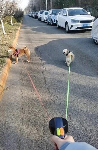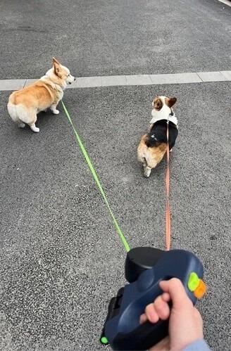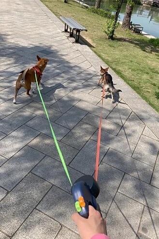 Con due guinzagli separati, ogni passeggiata diventa una sfida: cavi incrociati, mani occupate e nessuna sicurezza.