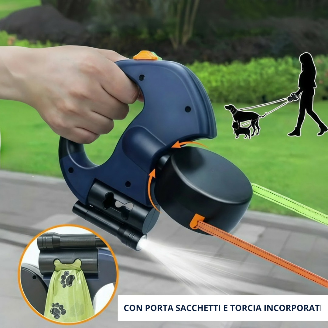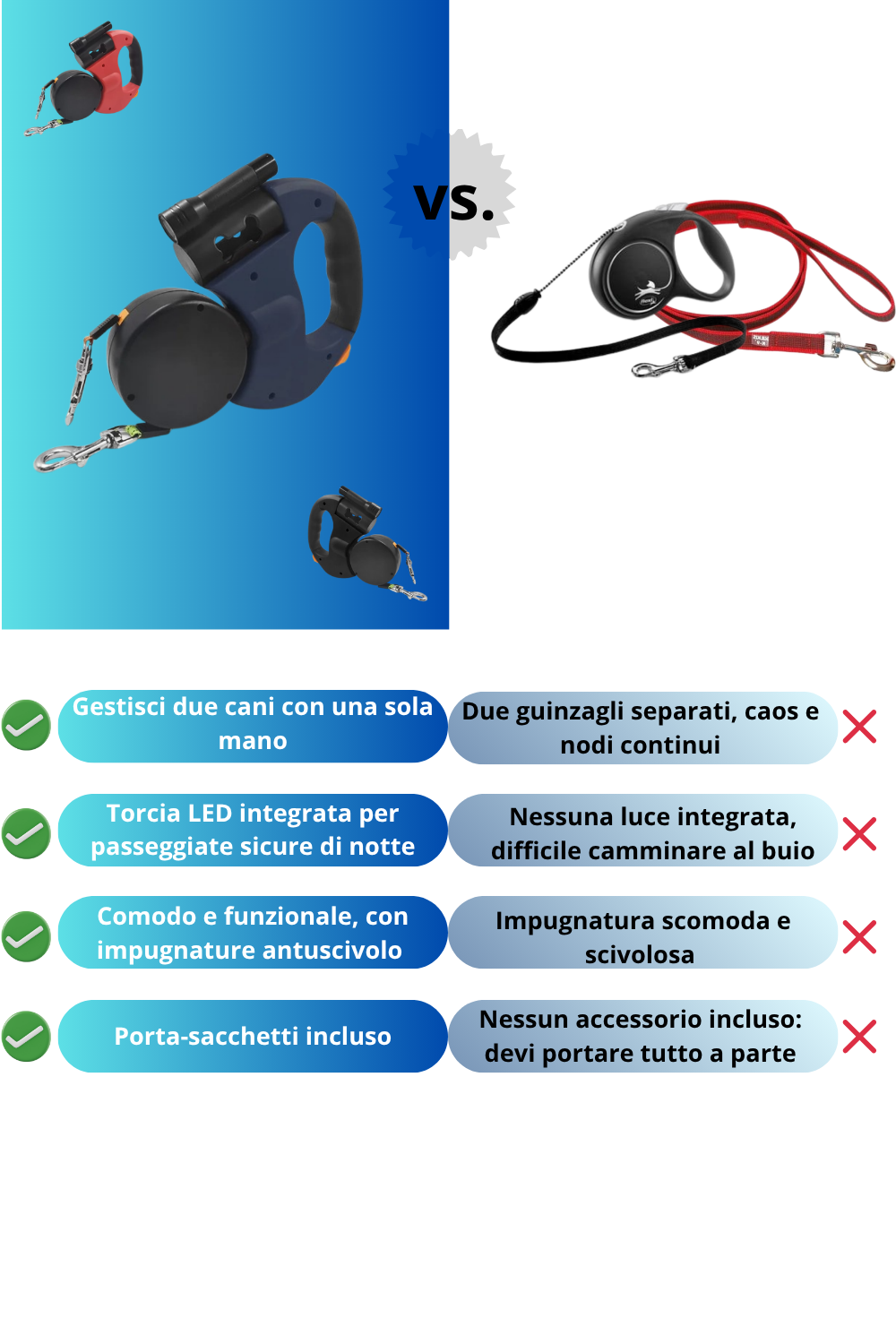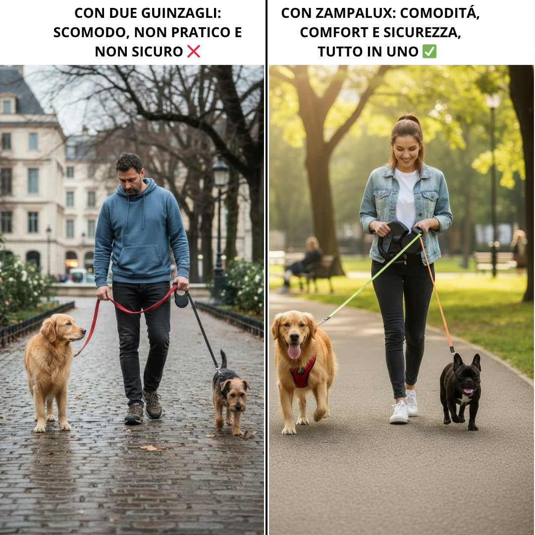 ZampaLux DuoLight - Guinzaglio doppio retrattile 360° con torcia LED integrata™